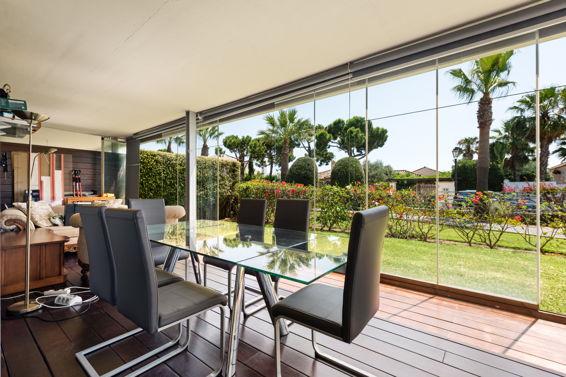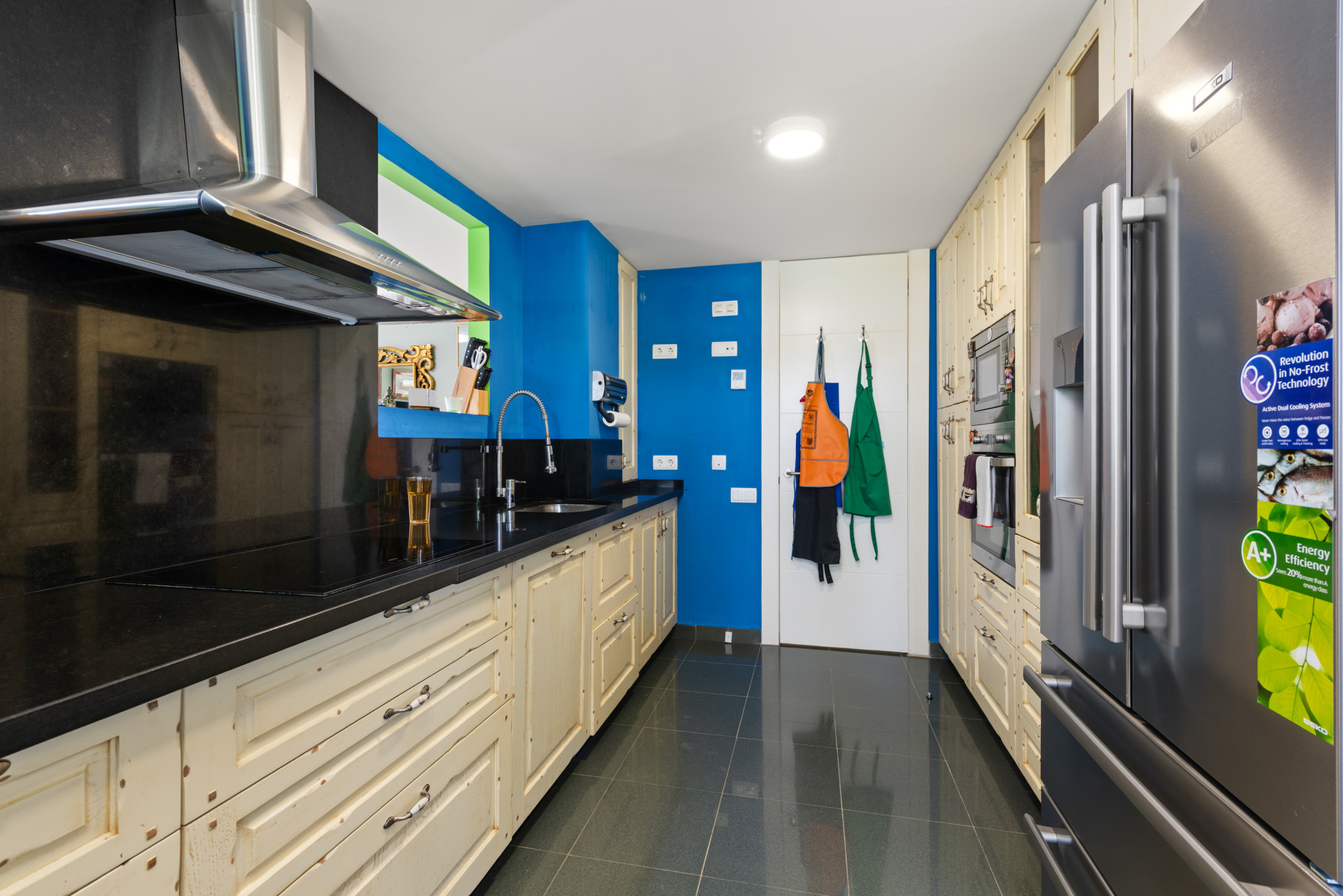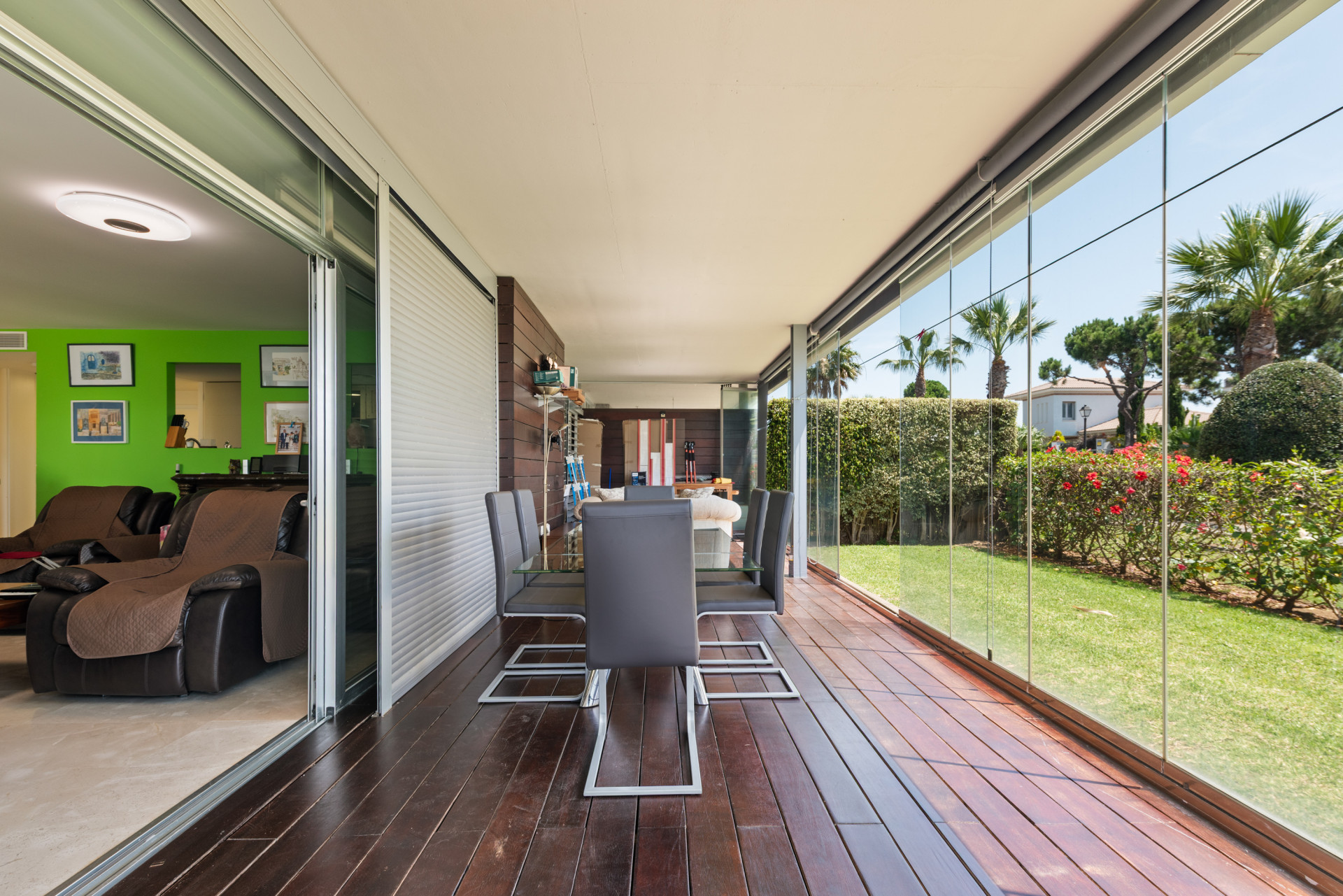 The property features four double bedrooms with high-end fitted wardrobes and three full bathrooms, one of which is en-suite with a hydromassage bathtub. Every bathroom showcases marble surfaces, teak wood details, and underfloor heating for maximum comfort. The fully equipped kitchen includes integrated appliances, Silestone countertops, and custom wood cabinetry, with direct access to a separate laundry room. From here, step out onto a 45 m² glazed terrace with a Lumon retractable system—ideal as a chill-out area—and a 50 m² private garden with partial sea views.