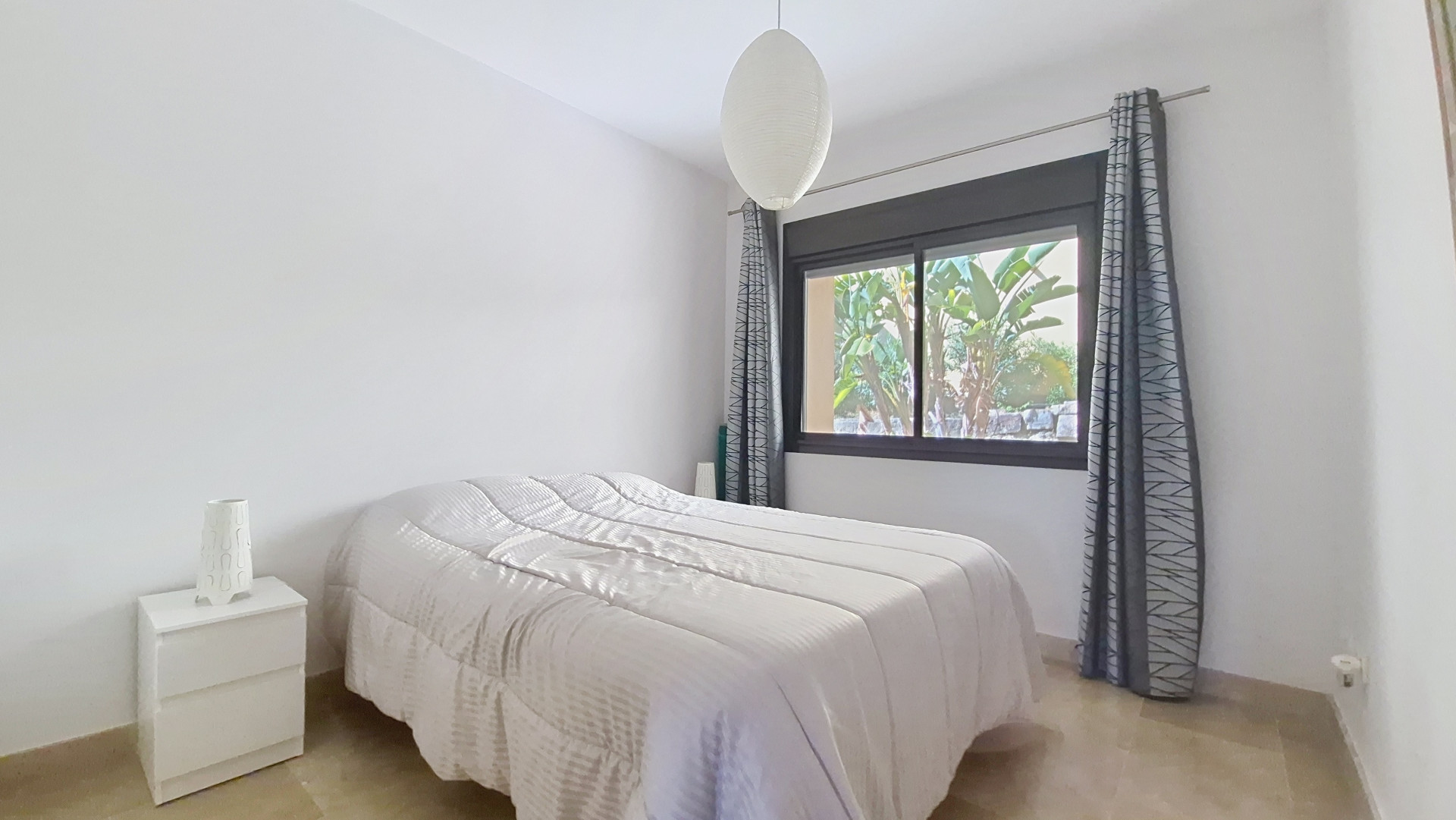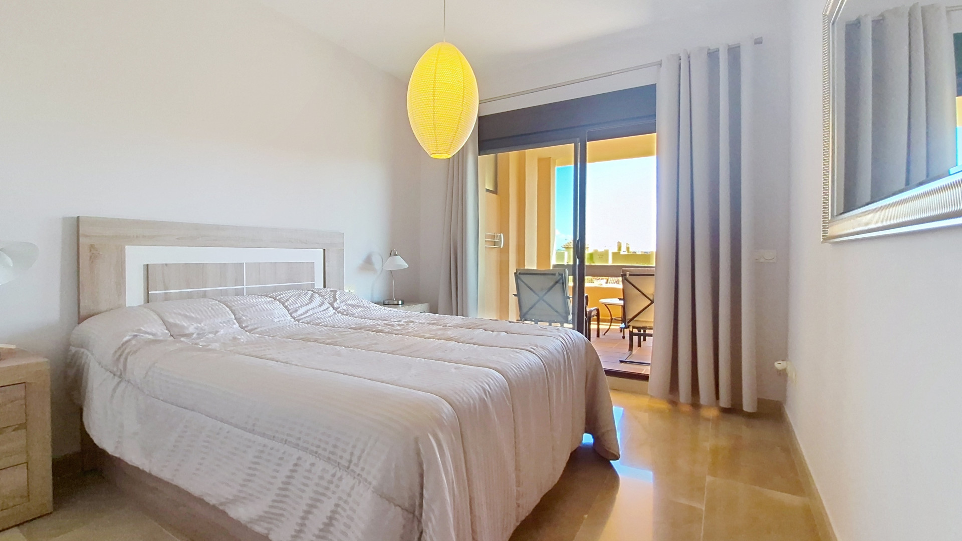 Está compuesto por tres dormitorios, uno de ellos en suite. Los otros dos comparten el mismo cuarto de baño y disfrutan de vistas a las zonas verdes de la urbanización. También dispone de una amplia cocina equipada, un lavadero y un salón espacioso con vistas al mar.