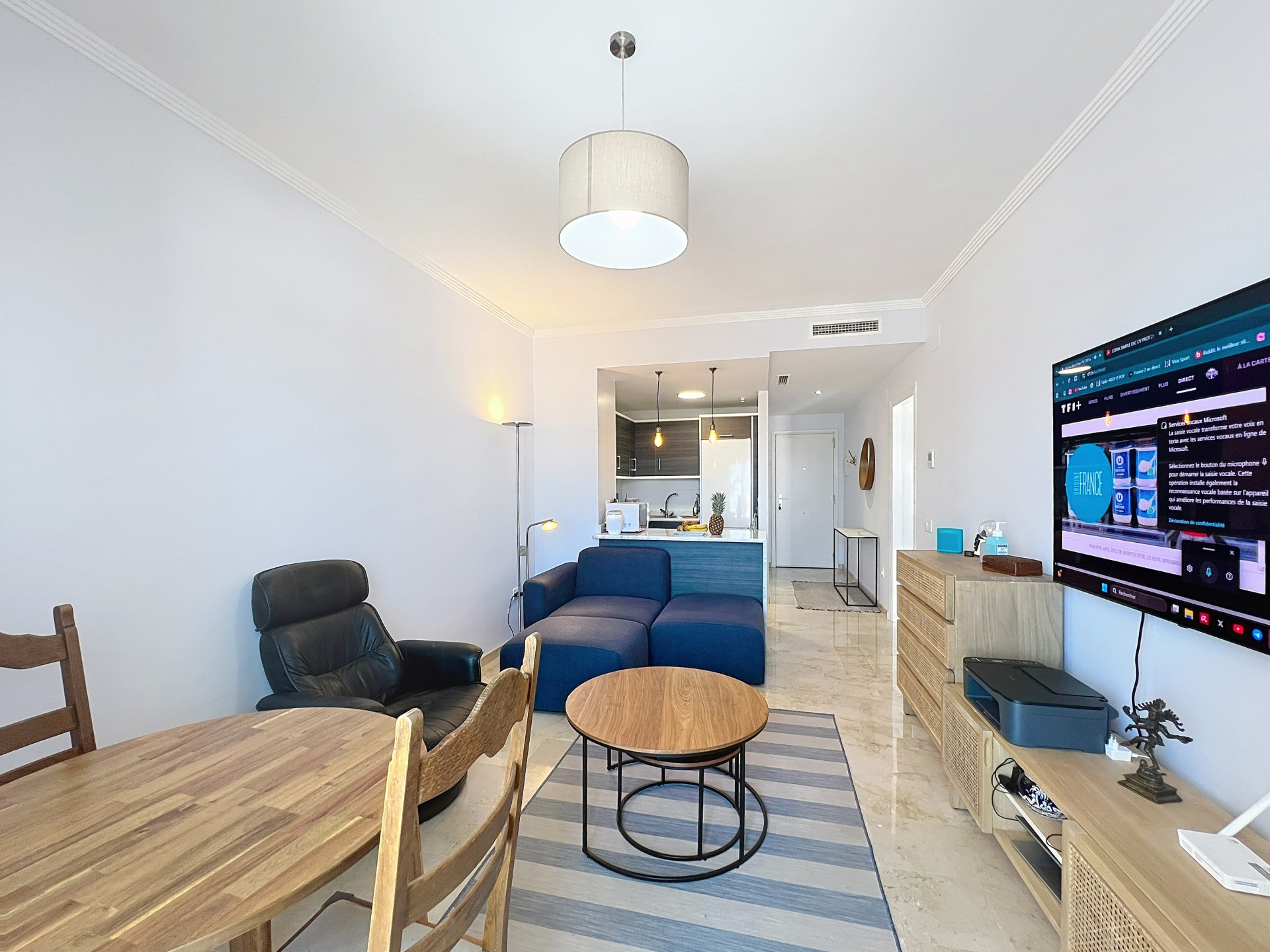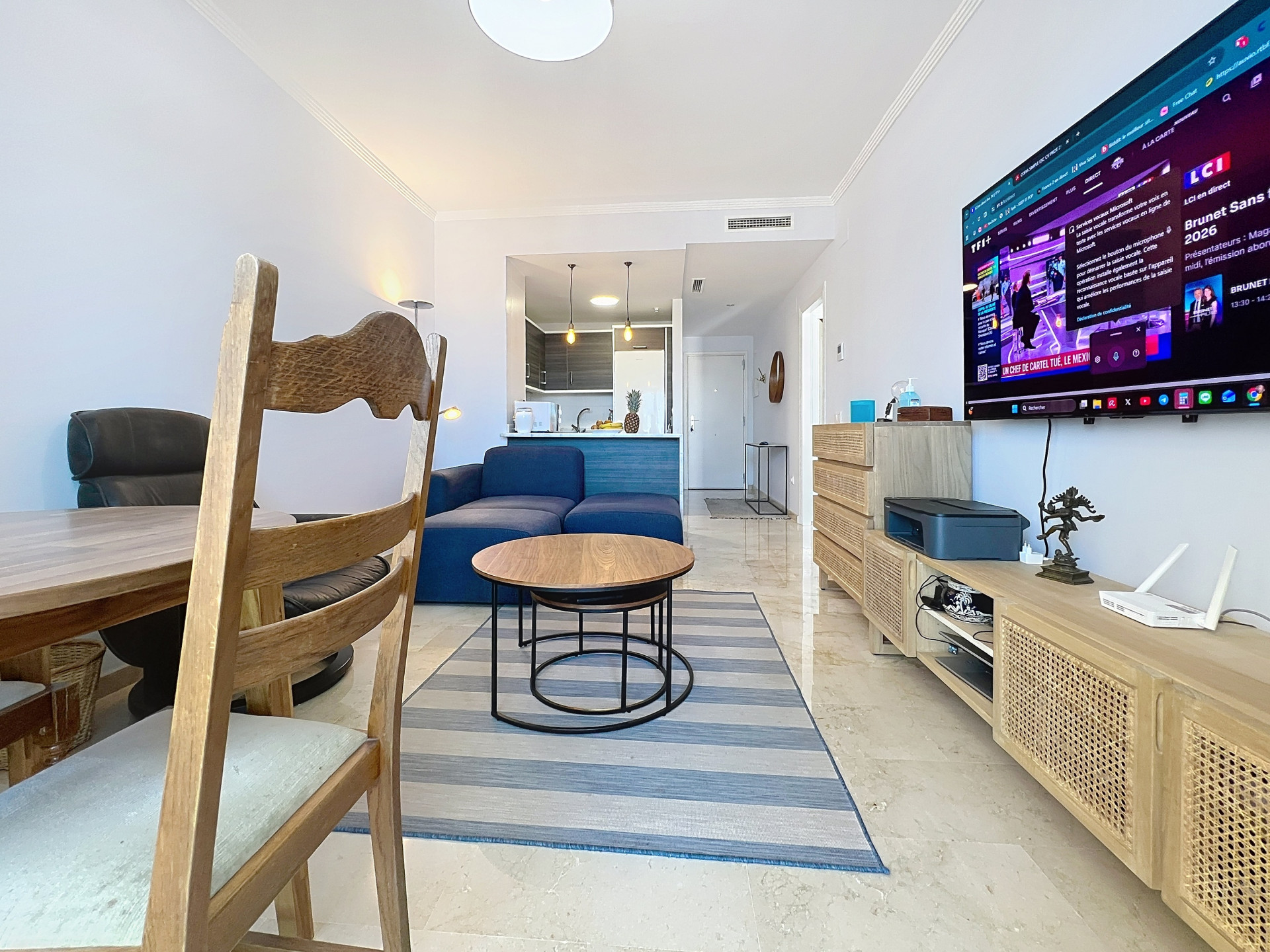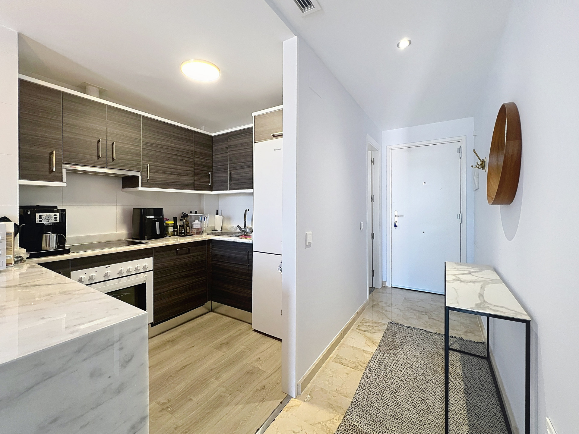 La vivienda se vende completamente amueblada y cuenta con cocina equipada y amueblada. Dispone de dos dormitorios, cocina abierta al salón, un baño completo, un aseo con zona de lavandería y dos agradables terrazas. Además, el apartamento cuenta con aire acondicionado frío/calor.